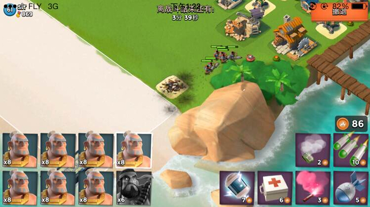 第一个烟雾先消失!周围的攻击型建筑会直接打胖子,胖子抗一波攻击火力,第二个烟雾跟着消失,野人爆本!