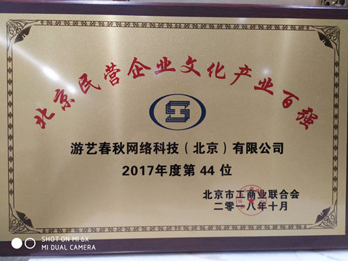 10月19日,由北京市工商业联合会首届北京民营企业百强发布会在怀柔区雁栖湖国际会展中心举行,并发布首份“北京民营企业百强”、“北京民营企业科技创新百强”、“北京民营企业文化产业百强”和“北京民营企业社会责任百强”榜单及相关调研报告。位居北京民营企业百强前三甲的分别是京东集团、联想控股股份有限公司和国美控股集团有限公司,营业收入总额均超过3000亿元,并以此跻身全国民营企业500强前十强。游艺春秋网络科技(北京)有限公司以突出的综合实力和卓越的创新能力成功跻身“2018年北京民营企业文化产业百强“,同时获奖的还有完美世界、蓝港互动、昆仑万维等文化企业。