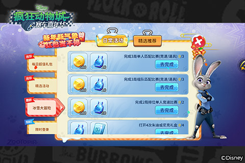 在这个热闹的冬季,参加比赛完成任务即可获得丰富奖励。当玩家累计在线时长到一定时间后,也可以领取金币和赛车强化零件。动动手指做个勤奋的赛车手,朱迪会看到你的努力。完成指定局数的单人匹配、组队匹配和单人排位等都能获得钻石、金币等游戏内奖励。虽然冬天即将过去,但是每一天都要有进步和收获哦!