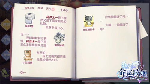 《命运歌姬》中的每个歌舞姬都有自己的日记本,在里面可以发现歌舞姬妾们隐藏事件。比如日常跳舞演出、完成任务、送礼物、升级升阶等等,都可能会被歌舞姬记在小本本上。当可以翻开日记本时,就能发现一些歌舞姬之间的小故事,比如艾莉娅是完全不能吃辣的类型,卡兹卡莉虽然是萝莉的外貌,但是总喜欢问石草各种关于恋爱的问题?不过年龄问题是石草禁止讨论的大禁忌!