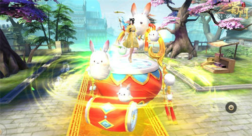 行吟处染沾白露轻霜,谈笑间迎沐金风细雨。以亮眼的金色作为底色,却使用了大胆的短裙和短袖设设计,华贵又不失利落。而挂件金风醉则是以展翅向上的仙鹤为主题,配上清亮的白色花朵点缀,更显韵味。除此之外,更有奇缘祈福中的最终大奖——奇缘水晶,使用奇缘水晶可以在奇缘商店中兑换永久双人坐骑“花鼓与兔”以及永久金色称号“奇缘锦鲤”(攻击力+100,致命+30)。花鼓与兔是一款充满童趣的双人坐骑,以花鼓为主题,红色与金色的搭配大方又不失华丽,缀上几只活泼可爱的Q版小兔,一蹦一跳的让人忍俊不禁。